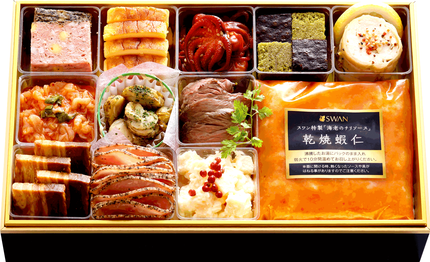 六十年来の歴史の中で培われた和・洋・中の美味しい詰め合わせ。スワンのシェフが一堂に会し、食材にこだわり、味にこだわり、丁寧に仕上げました。迎春の席を彩るお料理として、皆様で心ゆくまでご堪能ください。