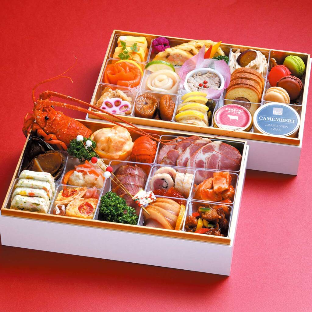 細かい仕上げと美しさにこだわりながら、伊勢海老やアワビなど豪華食材24品目の二段重。今年もスワンの味をそのままに、手作りの「生おせち」を一年間の感謝の気持ちを込めてお作りします。